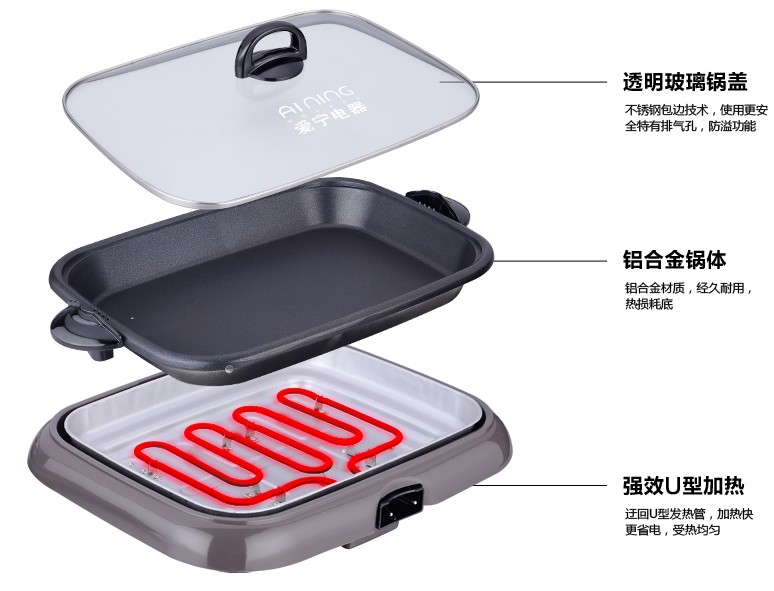多功能電烤盤,外形大方,結構簡單,雙層水性涂層,分體式,便于清潔,集烤、烙、煎、炸、炒于一身。